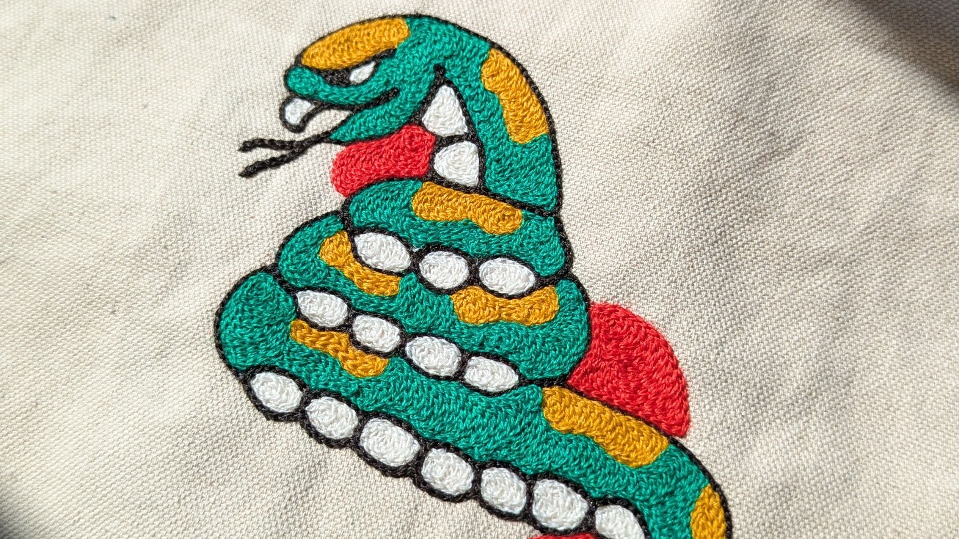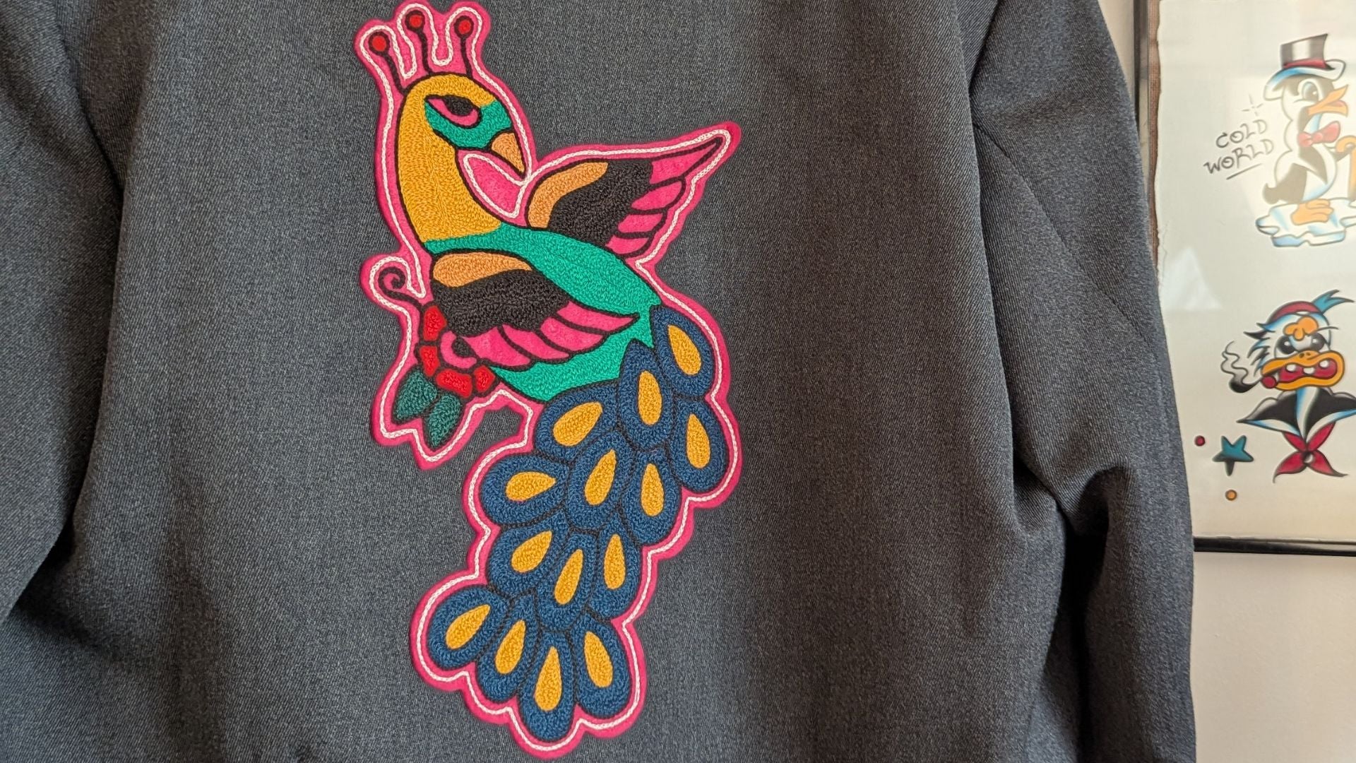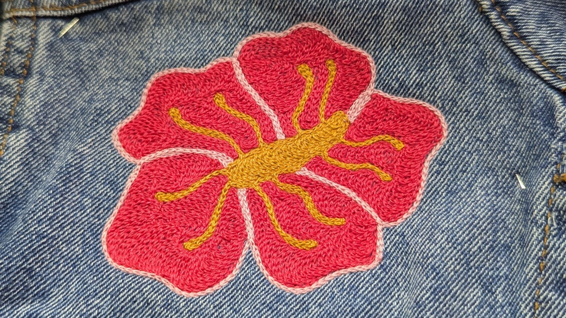 Chaque broderie est réalisée à la main avec une ancienne machine Cornely à guidage manuel.